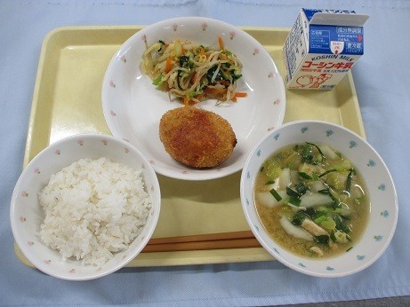 「ごはん・牛乳・大豆コロッケ・キャベツと小松菜のからし和え・きのこのみそ汁」です。