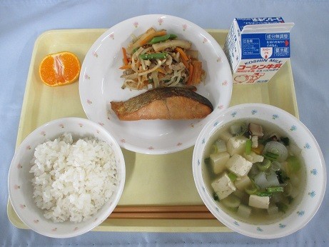 「ごはん・牛乳・鮭のうま味噌焼き・浦上そぼろ・ヒカド・みかん」です。