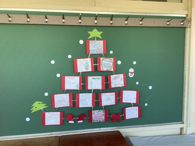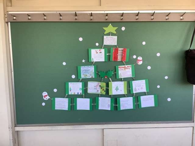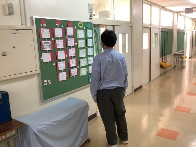 作品が廊下に飾られ、クリスマスの雰囲気が味わえる掲示となっております。
