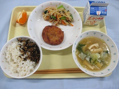 「ごはん・ひじきふりかけ・牛乳・たらと豆腐のすり身揚げ・もやしとハムの香味和え・キャベツのみそ汁・みはやオレンジ」です。