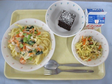 「生パスタのクリームスパゲッティ・牛乳・ポテトとベーコンのハニーサラダ・ココアケーキ」です。