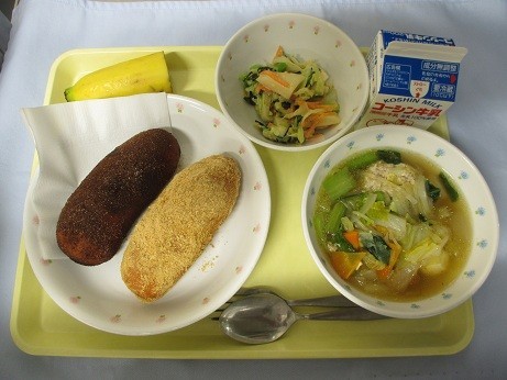 「二色揚げパン(きなこ・ココア)・牛乳・肉団子スープ・バナナ」です。