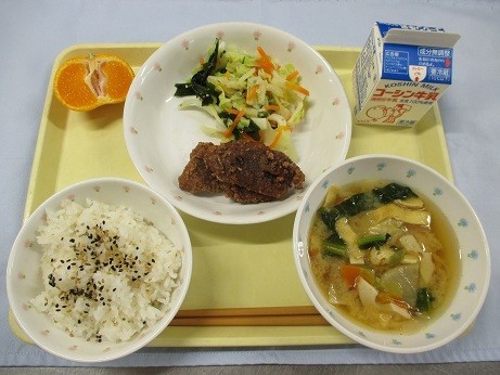 「ごましおごはん・牛乳・くじらの竜田揚げ・わかめの和え物・七彩汁・みかん」です。