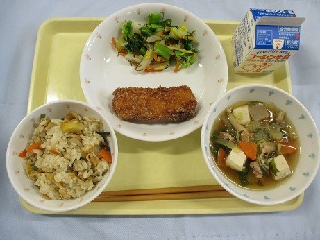 「五目ぶかし(山菜おこわ)・牛乳・いかのさらさ揚げ・おみ漬け・いも煮」です。