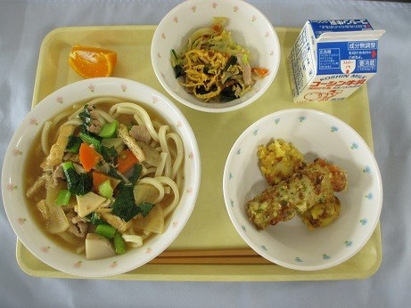 「味噌けんちんうどん・牛乳・ちくわの金棒揚げ(青のり味とカレー味)・友禅和え・はるみオレンジ」です