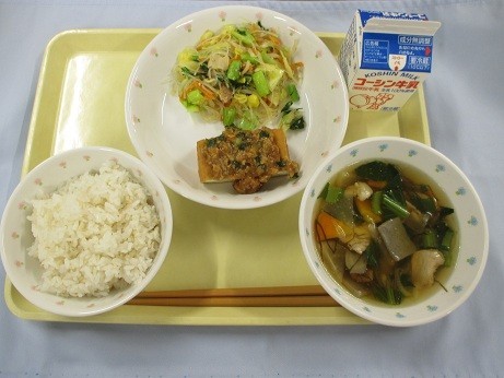 「ごはん・牛乳・厚揚げの肉味噌かけ・春雨と小松菜の炒め物・いろどり汁」です。
