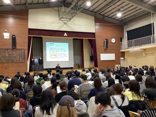 本日は令和8年度に入学を予定している方を対象にした第2回新入生保護者学校説明会が実施されました。お忙しい中、多くの保護者と児童が来校してくださりありがとうございました。校長からは本校の学校の特色と身につけてもらいたいことなどを説明させていただきました。生活指導主任からは動画を交えて本校の学校生活の紹介がありました。出演してくれた生徒はどの生徒も笑顔で会場が明るくなりました。他には本校の学習、学校行事、給食について担当から説明がありました。