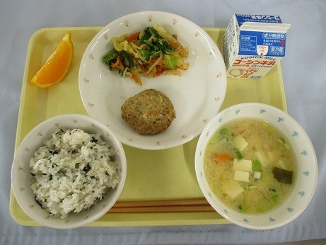 「わかめごはん・牛乳・あじのさんが焼き・キャベツと菜の花のおかか和え・ふうかし(あさりのみそ汁)・しらぬい1/6」です。