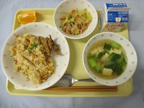 「煮豚チャーハン・牛乳・わかさぎのごまがらめ・春雨のサラダ・中華スープ・いよかん」です。