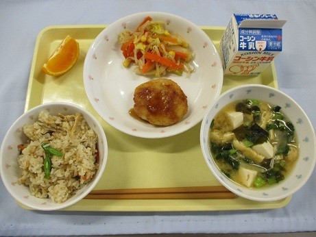 今日の給食は埼玉県の郷土料理献立です。「糅飯(かてめし)」は混ぜ合わせるという意味の「糅てる」が語源です。昔、お米が貴重な食べ物だったため、米に野菜や山菜、きのこなどを混ぜ合わせて量を増やして食べたことからこの名前がついたといわれています。