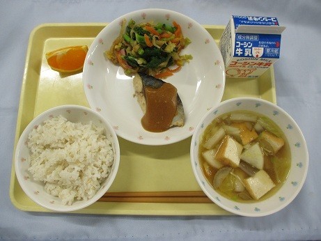 「ごはん・牛乳・さばのごまだれ焼き・菜の花の和えもの・のっぺい汁・清見オレンジ」です。