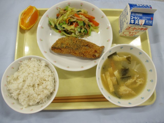「ごはん・牛乳・マスのセサミフライ・春キャベツと小松菜の甘酢和え・じゃがいものみそ汁・デコポン」です。
