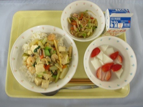 「豆腐とえびとあさりのうま煮丼・牛乳・中華サラダ・いちご杏仁」です。