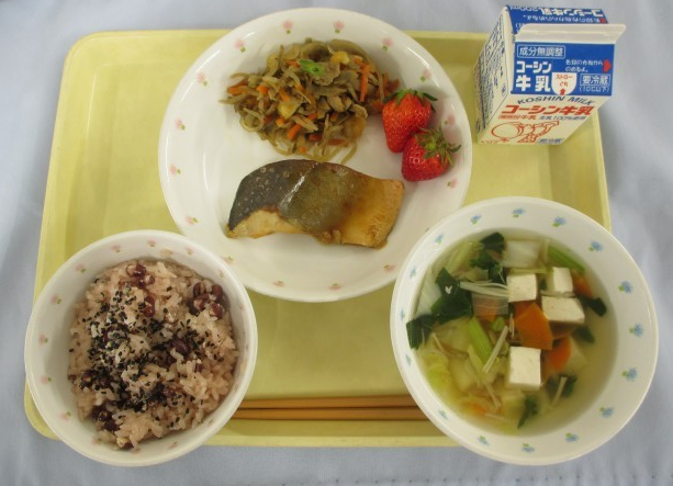 「赤飯・牛乳・ぶりの照り焼き・五目きんぴら・紅白すまし汁・いちご」です。