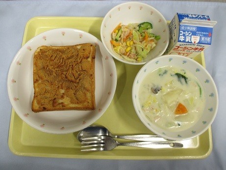 「セサミトースト・牛乳・クラムチャウダー・オニオンドレッシングサラダ」です。