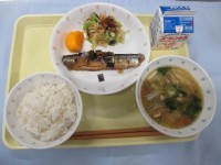 「チキンライス・牛乳・チーズ入りポテトオムレツ・小松菜と大豆のサラダ・あじさい寒天ポンチ」です