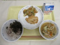 献立 ごはん 牛乳 ししゃものごま揚げ ひじきとツナの和え物 けんちん汁 りんご(1/6)