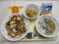 豆腐の中華丼牛乳切干大根とハムの中華和え春雨スープみかん