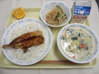 いわしの蒲焼き丼牛乳茎ワカメのごま酢和え豆乳入りみそ汁スイートスプリング