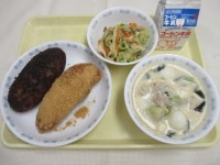 大豆入り五目御飯牛乳レバーの変わり香味だれじゃが芋の変わりきんぴら白菜と豆腐のか...