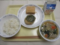 ごはん 牛乳さばのしょう油揚げキャベツと小松菜のごま和え五目みそ汁でこぽん