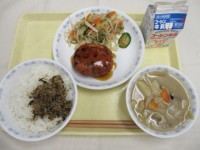 ごはん ごまじゃこ小松菜ふりかけ牛乳とり肉と豆腐のつくね揚げ茎ワカメと切干大根の...