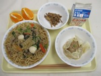 焼きうどん牛乳じゃがたこ揚げもずくのかきたまスープ三色白玉フルーツ