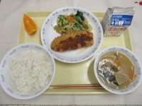 ごはん 牛乳マスのフライ春キャベツと小松菜の甘酢和えじゃが芋のみそ汁でこぽん
