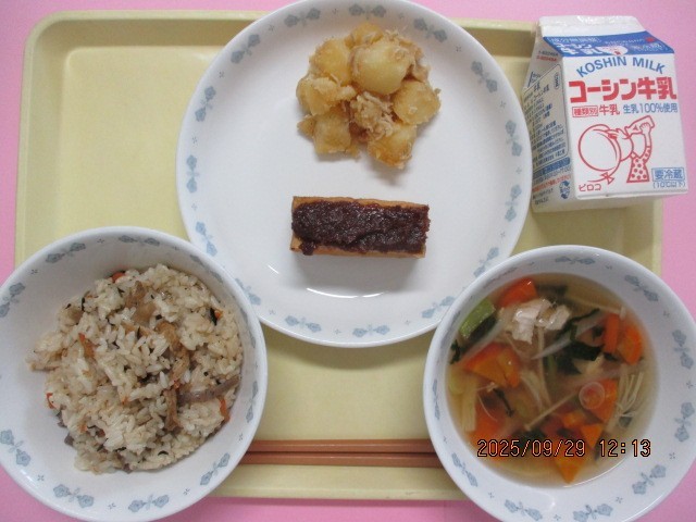 9月の給食も残り2日となりました。今日は食物繊維たっぷりのひじきごはんに、鉄分豊富な厚揚げに、にんにくの風味をきかせたごまみそを塗り焼いた、厚揚げのごまみそ焼きを作りました。爽やかな気候の日が増え、食べ物がより美味しく感じられる季節です。最近はおかわりに並び、マナーを守りつつもにぎやかな給食の様子が見られます。明後日からは10月。旬の食材がたくさん使われます。秋を楽しむ給食時間にしてほしいと思います。