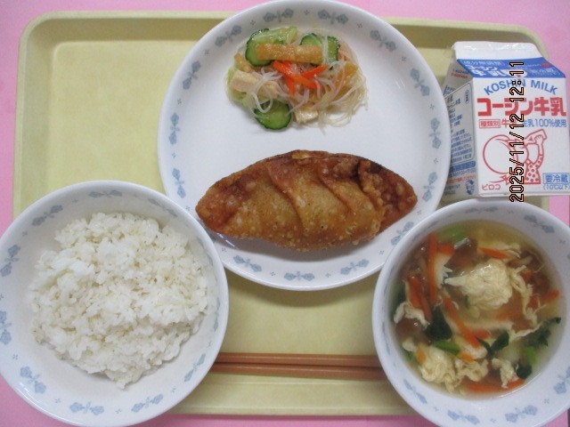 期末考査2日目でした。ジャンボ揚げ餃子は人気のあるメニュー。ごはんが進むおかずです。楽しみにしていた人も多かったのか、給食前にチェックをして、教室へ戻る人もいました。明日で期末考査も終わりです。体調管理をして、万全の体調で最終日をむかえてほしいと思います。