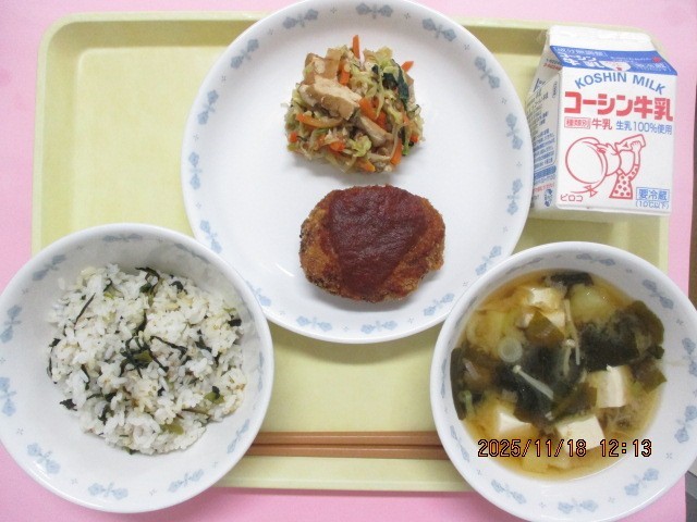 SDGs給食週間です。今日は、毎年の恒例給食行事、「小松菜一斉給食」も兼ねていました。近隣の農家の方から、1人50g、24Kgもの小松菜を無償でいただき、今日は、ごはん、メンチカツ、煮びたしに使いました。この取組は、SDGsの目標8「働きがいも経済成長も」につながっています。今日も素早い準備で、しっかり食べ、SDGsに取組む生徒たちでした。