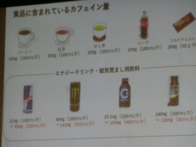 最後に、中学生にとっても日常的に摂取しているお茶やコーヒー、ドリンク類に含まれているカフェインの過剰摂取についてのお話がありました。