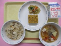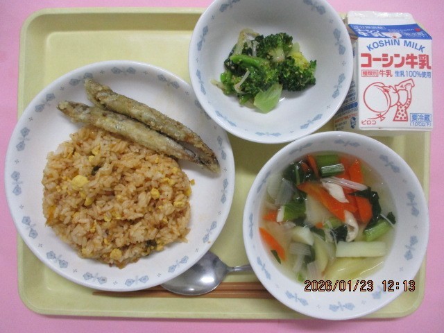 今日はチャーハンを作りました。キムチが入ったチャーハンは、人気の高いメニューです。給食前でしたが、美味しそうな香りに誘われ、給食室前は賑わいをみせていました。来週は学校給食週間です。給食の意義や給食について理解を深める1週間です。様々な給食が出ます。楽しみに待っていてください。