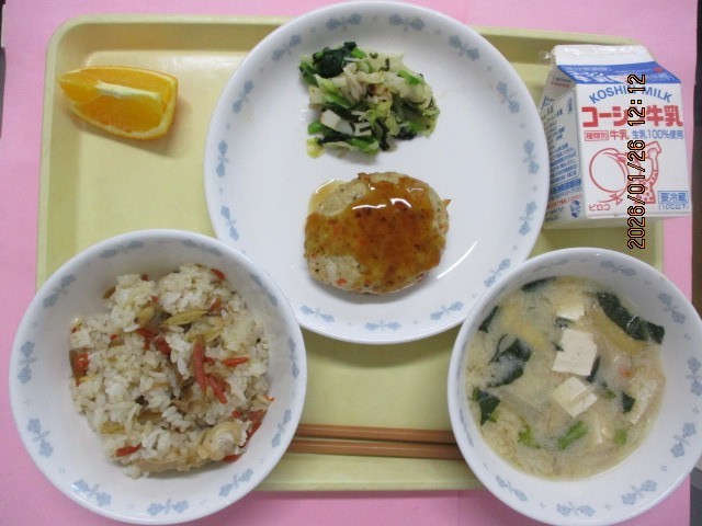 今週は、学校給食週間です。今日は東京都の郷土料理、深川めしを作りました。おかずには、昔江戸川区で生産されていた、れんこんを使ってつくね焼きを作りました。給食委員から、朝学活や給食時間に、学校給食週間のお知らせをしました。今週は、特に自分自身の健康のために食事をすることや、食に関することを改めて学ぶ1週間にしてほしいと思います。