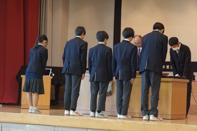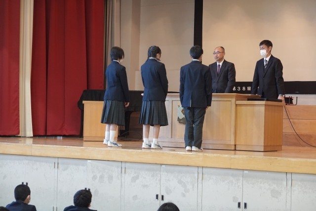 朝礼の終了後、東京都のロードレース大会に出場して上位入賞した生徒の表彰と、江戸川区の作品展に書き初め作品を出品した生徒の表彰が行われました。