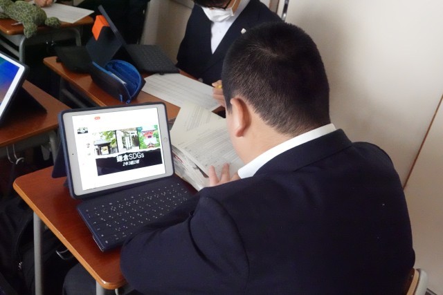 班行動をしながら鎌倉の街や寺社で発見したSDGsの取り組みについて班ごとにプレゼンテーションソフトを使って6分間で発表しました。