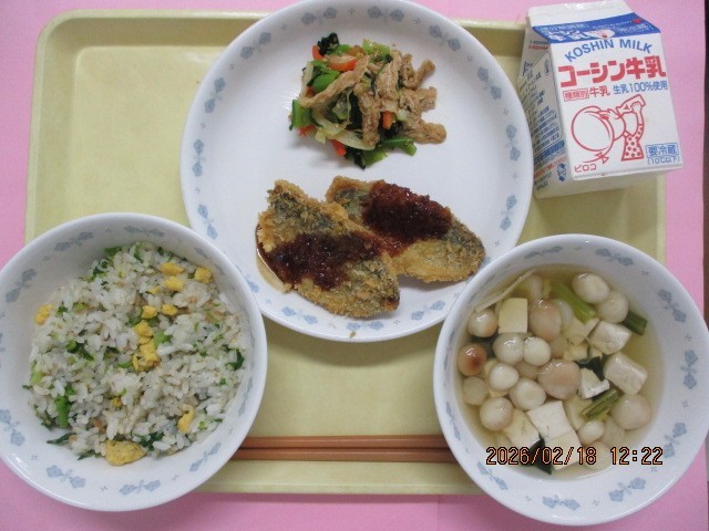 今日は、春の食材「菜花」を使った給食でした。菜花は、食用の花の芽を摘み取ったもので、緑黄色野菜の1つです。ビタミンやミネラルが豊富で、免疫力アップにも役立ち、季節の変わり目の健康管理にぴったりの食材です。いり玉子とそぼろと混ぜ込み、春の色彩でした。フライには、あじを使いました。DHAやEPAを含み、学習に力を入れるこの季節にオススメの食材です。昼間の暖かさに、春を感じられるようになってきました。季節の変わり目なので、規則正しい食生活で健康管理をしましょう!