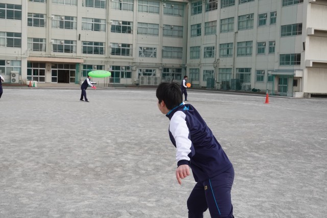 2月20日(金)の2校時、3年生の男子の体育の授業ではアルティメットに取り組んでいました。