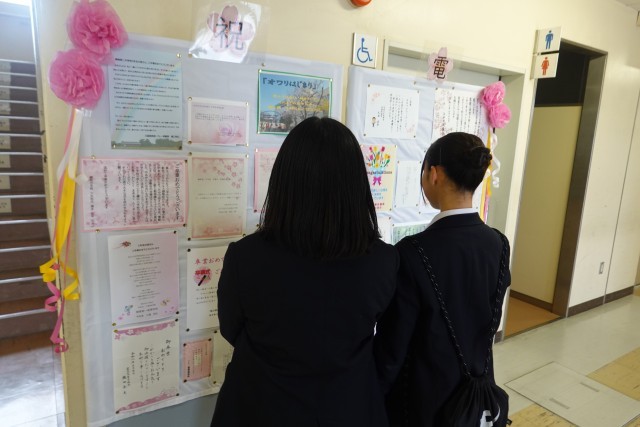 卒業を祝して寄せられた祝電が3年生の昇降口に掲示され、登校した卒業生が1通1通に見入っていました。