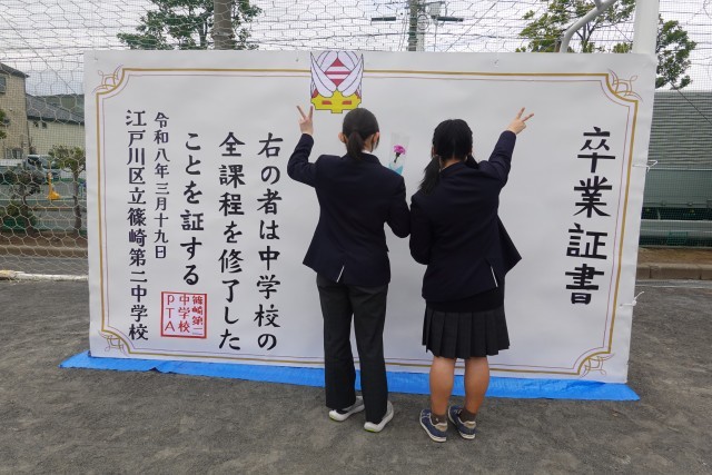 その後、校庭で3年生の交流の時間が設けられ、PTAが用意して下さった撮影スポットなどを使い思い出の写真を撮り、語り合って名残を惜しみました。