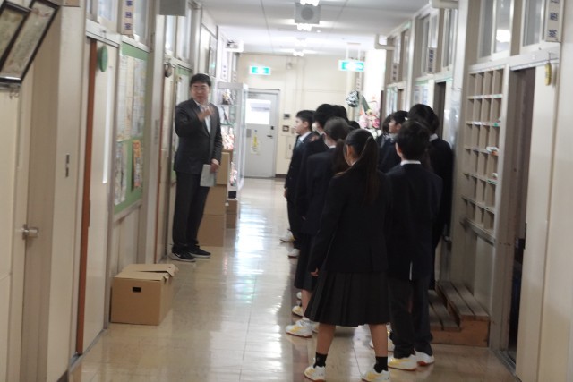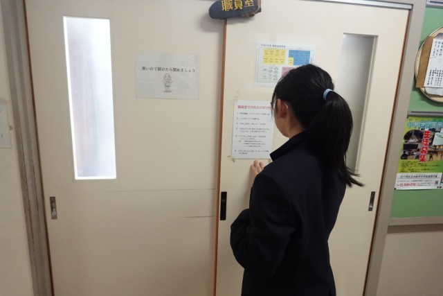職員室では入室の際の方法について説明を受けた後、代表の生徒が先生を実際に呼ぶまでを実践し、仲間から拍手を受けていました。