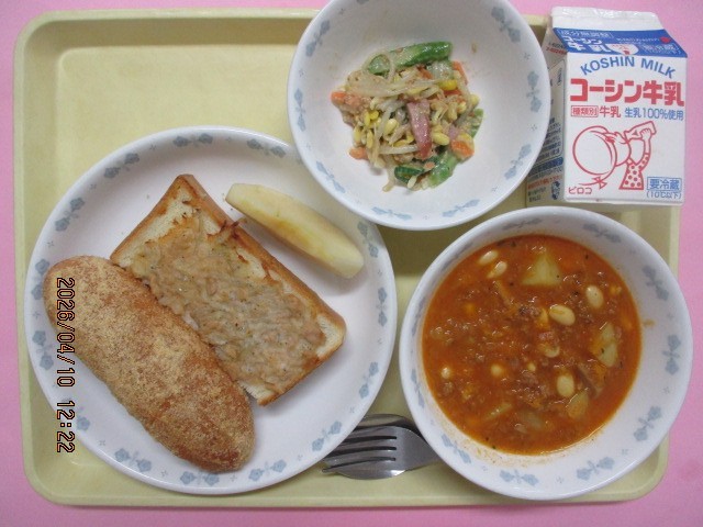 今年度初めてのパンの献立。篠崎二中では、2種類のパンが提供される日があります。どちらもしっかり食べられた人が多かったようで、特に揚げパンは不動の人気で、1年生もほとんどのクラスで完食でした。おかずには、旬のアスパラガスが入ったサラダと、豆たっぷりのチリコンカンでした。今年度も苦手なものも残さず食べ、自分自身で健康管理ができるようになってほしいと思います。