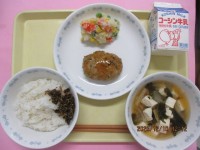今日はパンの献立でした。パンにはカルシウムがたっぷりのちりめんじゃこが混ぜ込まれて、苦手な人も美味しくカルシウム補給できる料理でした。午前授業でバタバタとしていましたが、早めに準備を終えられ、ゆっくり食べられていました。