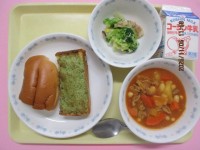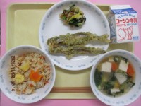今日は旬のかつおを揚げ、甘辛いタレでからめたものをご飯に混ぜ込んだ「かつおめし」を作りました。しその香りがポイントでした。かつおは赤い身をしていることからも想像がつくように、たんぱく質と血を作る栄養素が豊富な食材です。昔から日本人に親しまれてきた歴史があります。果物の「カラマンダリン」は皮がうすく、手でもむけるものです。濃い味が特徴でした。午前授業だったため慌ただしい給食時間でしたが、しっかり食べられていましたね。旬の食材を食べ、今週を乗り切りましょう!