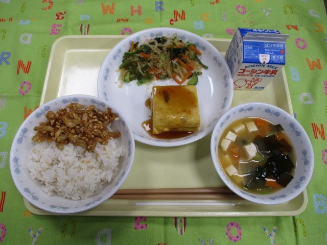麦ごはん アーモンドごぼう かぼちゃの卵焼き 大根とわかめの和風サラダ 豆腐と野菜のみそ汁