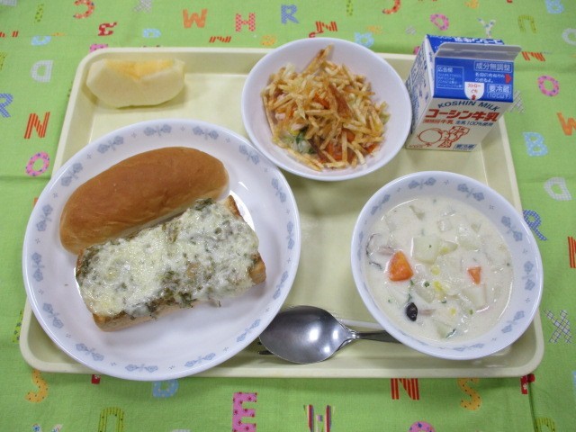 しらすチーズトースト レーズンパン 揚げじゃが芋のチップスサラダ コロコロ野菜のミルクスープ りんご