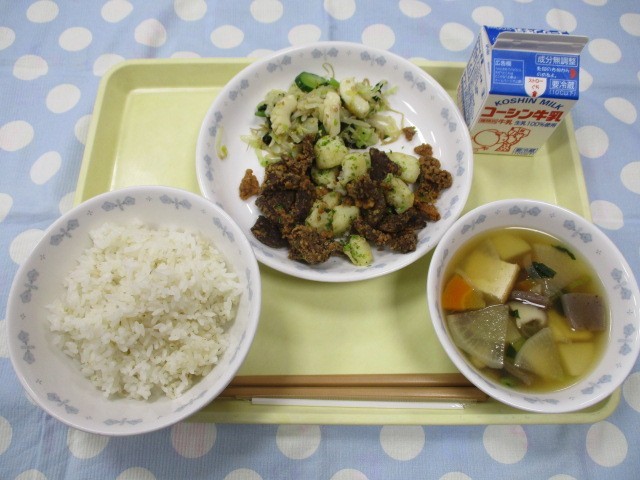 麦ごはん 豚レバーと揚げじゃがの海苔塩風味 イカとわかめの酢の物 けんちん汁