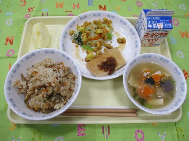 きんぴらごはん いかの香味焼き じゃが芋と大豆のピリ辛和え 野菜たっぷり白玉汁 りんご