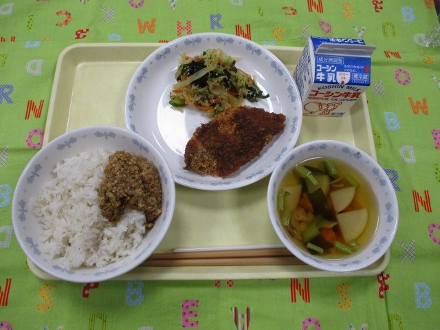 麦ごはん 甘辛大豆肉みそ ぶりカツ 大根とわかめの和風サラダ かぶとエリンギのすまし汁