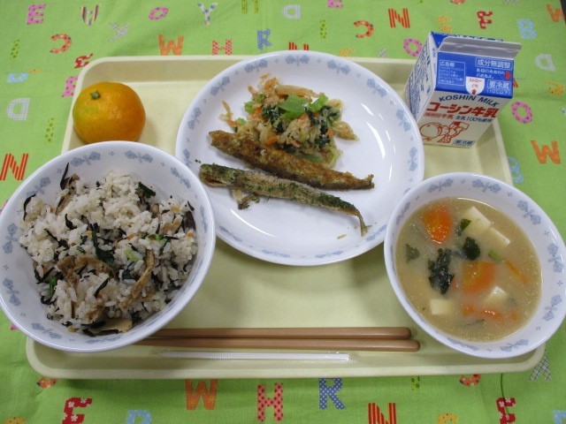 ひじきごはん ししゃもの二色揚げ キャベツとツナのピリ辛和え すりごま風味みそ汁 みかん